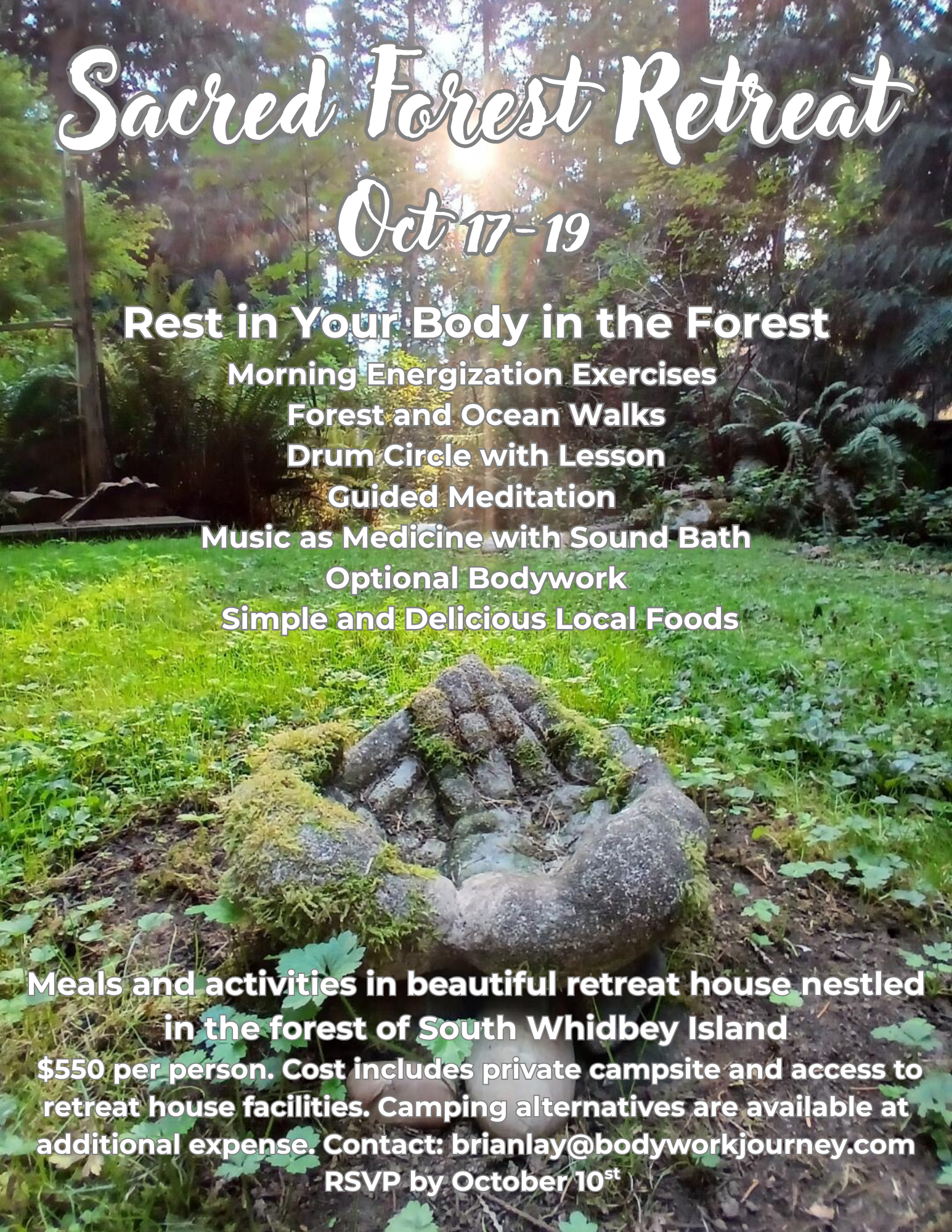 Back to All Events Sacred Forest Retreat Friday, October 17, 2025 3:00 PM Sunday, October 19, 2025 1:00 PM Google Calendar ICS