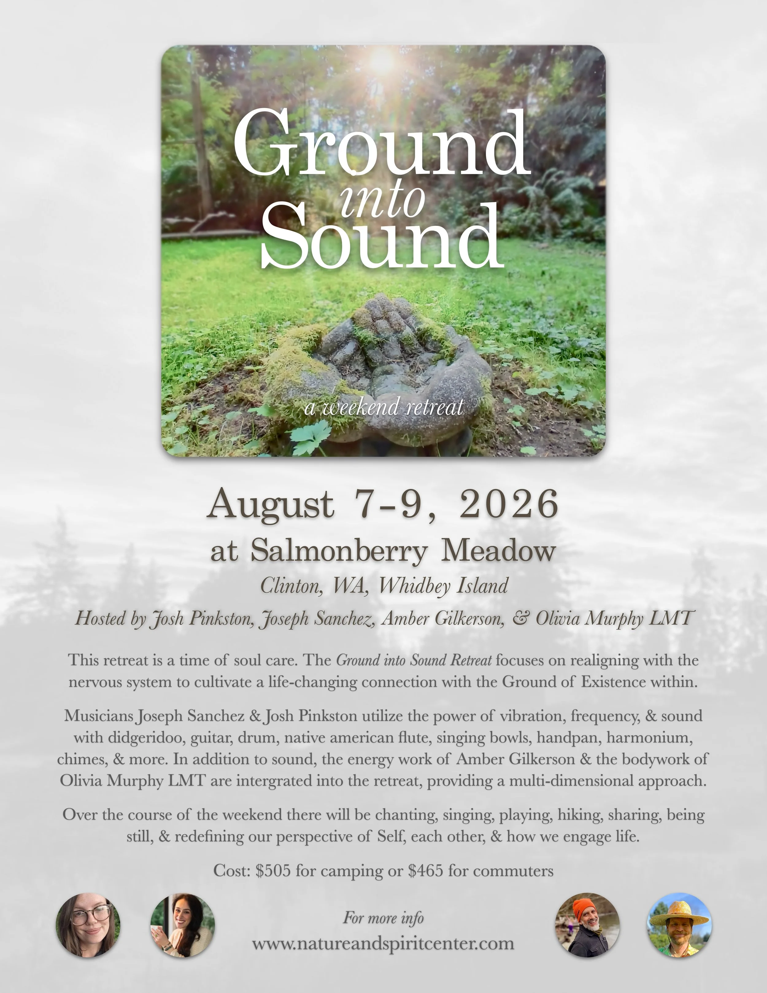 Ground Into Sound - a weekend retreat Friday, August 7, 2026 4:00 PM Sunday, August 9, 2026 2:00 PM Google Calendar ICS